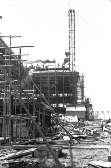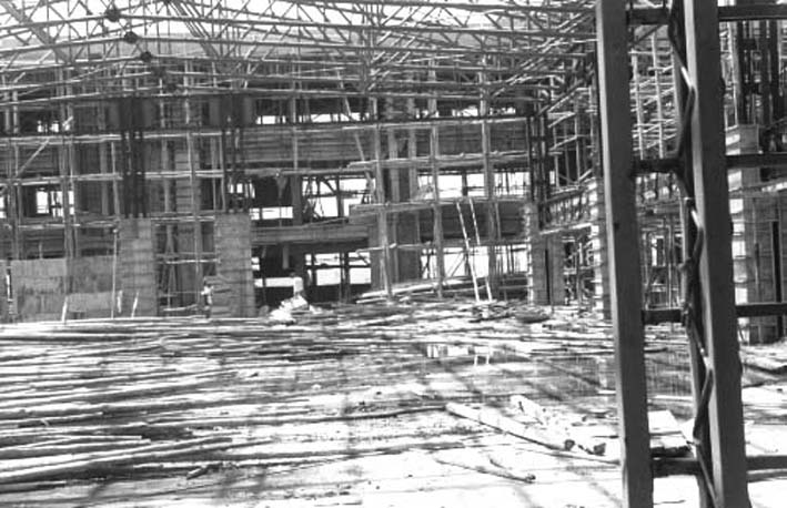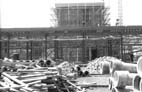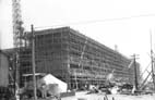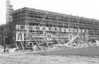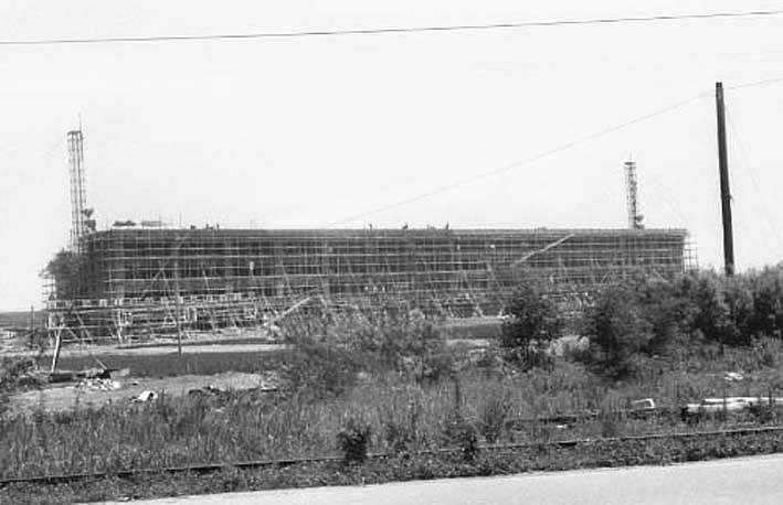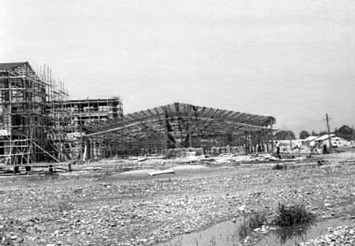 金石往還より見た建設中の校舎 (金石線電車のレールが見える)