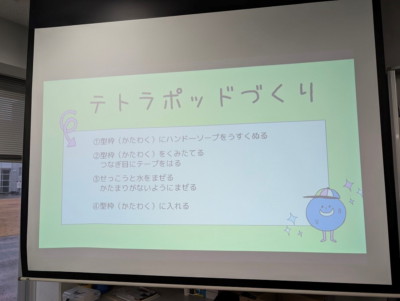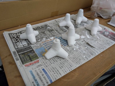 テトラポッドとは、海岸や河川などの護岸や水制を目的に設置するコンクリートブロックのことで、通称 波消しブロックといわれます。テトラポッド製作だけでも、様々な作業があり、親子で協力して楽しく製作することができました。