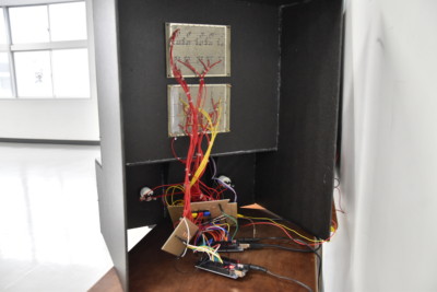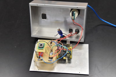 コントローラはマイコンボード「Arduino」を使用しました。筐体にはアルミ製の箱を使用し、ボタン配置を考えながら、穴を開けるなどの加工をしました。慣れない加工作業で苦戦しつつも、ガタツキなく作れるよう工夫しました。ボタンのご動作がないように堅牢なプログラムの作成にこだわりました。