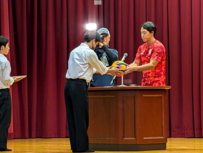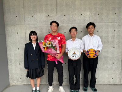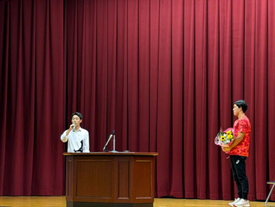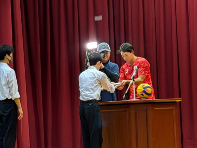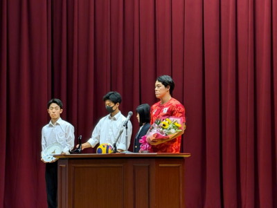 その後、新田選手から記念品贈呈、生徒会副会長より花束贈呈、生徒会長がお礼の言葉 を述べました。