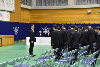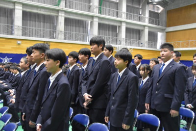 校歌斉唱では、在校生の野球部が力強い歌声を体育館いっぱいに響かせました。壇上には生花部による作品が飾られ、祝福や未来への願いが込められた花々が新入生の入学に彩りを添えました。